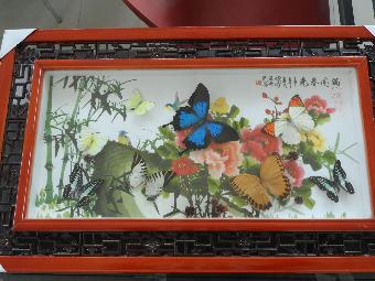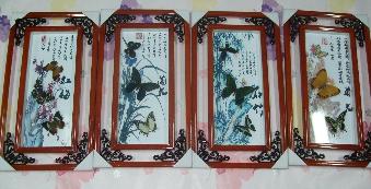 产品简介:蝶儿们与优雅中国风底图完美结合,配上古韵红木镂空边框,诗情画意跃然纸上,给人以优雅的享受,是极具品位的装饰、馈赠佳品。
