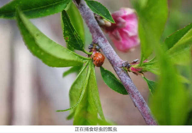 起初是在实验室小规模养殖瓢虫,在我们的大棚里做一些实验,然后慢慢扩大养殖量。在期间,我们研发出天敌瓢虫组合式释放体系,并推出一系列集科学、实用、环保于一体的生态产品,以达到农业可持续发展的目的。 理论与实践相结合,我们与两家种植基地进行了项目产品实践,在枣庄市山亭区的维他康健生态农业有限公司的桃园已经实现了露天环境下的大规模天敌昆虫释放,并收到明显成效,取得了一定的成效,仅人工成本就每亩每年节省110-170元不等,卖桃也比往常翻了四倍左右,且品质优良;在潍坊市的水果种植基地草莓棚里,蚜虫病虫害厉害,草莓植株受到侵害,然后往棚里释放异色瓢虫,病虫害得到了进一步的控制。我们的目的就是争取将异色瓢虫防治蚜虫技术的应用率达到蚜虫危害防治市场的80%以上,尽可能最大范围的实现生态植保。 桃园中发生蚜虫害的枝条